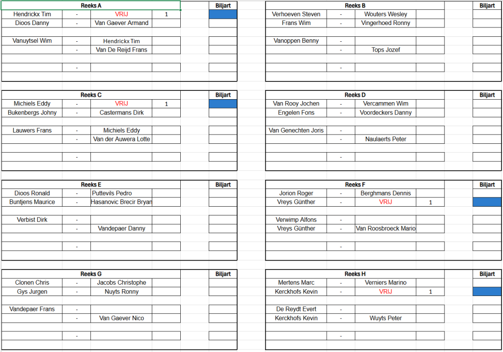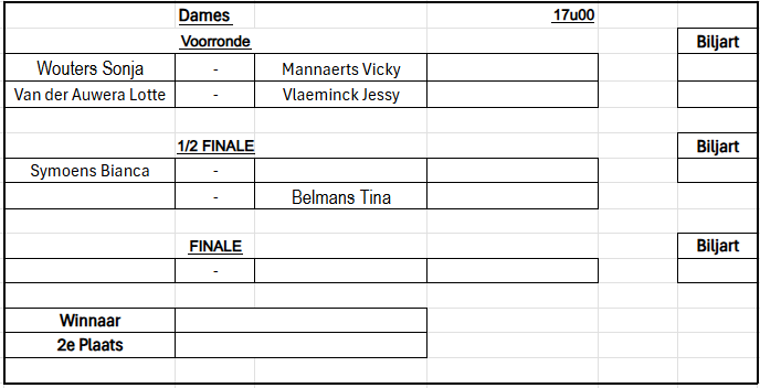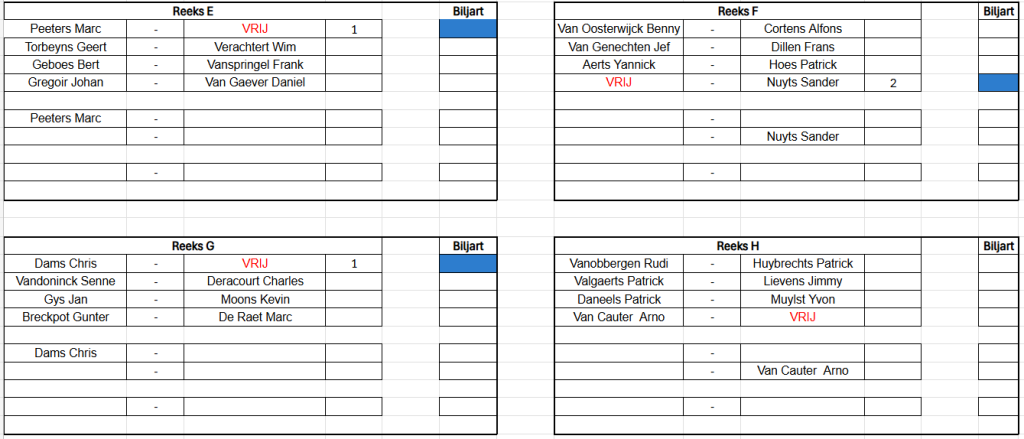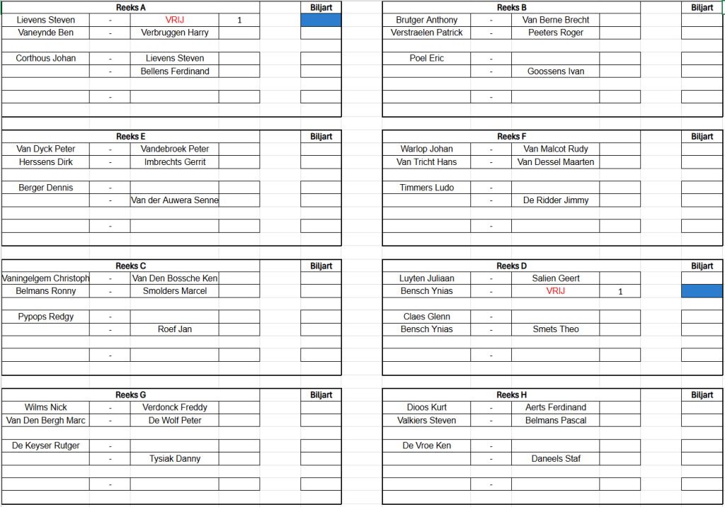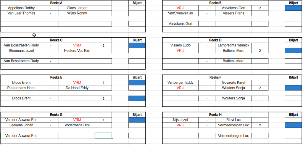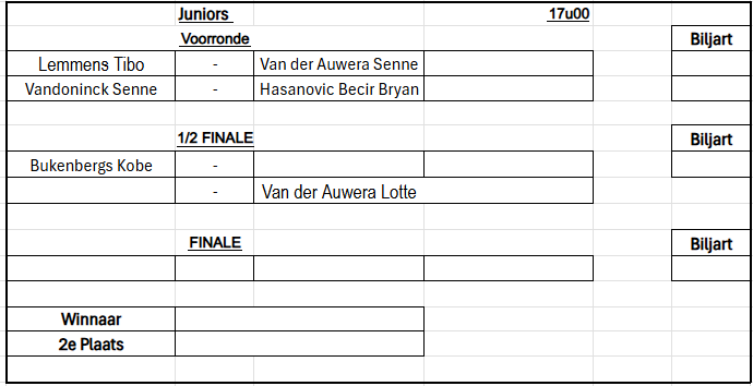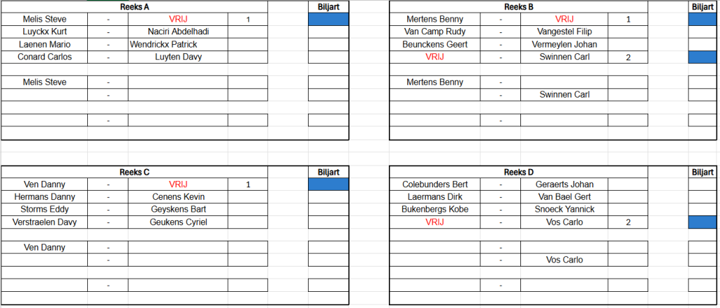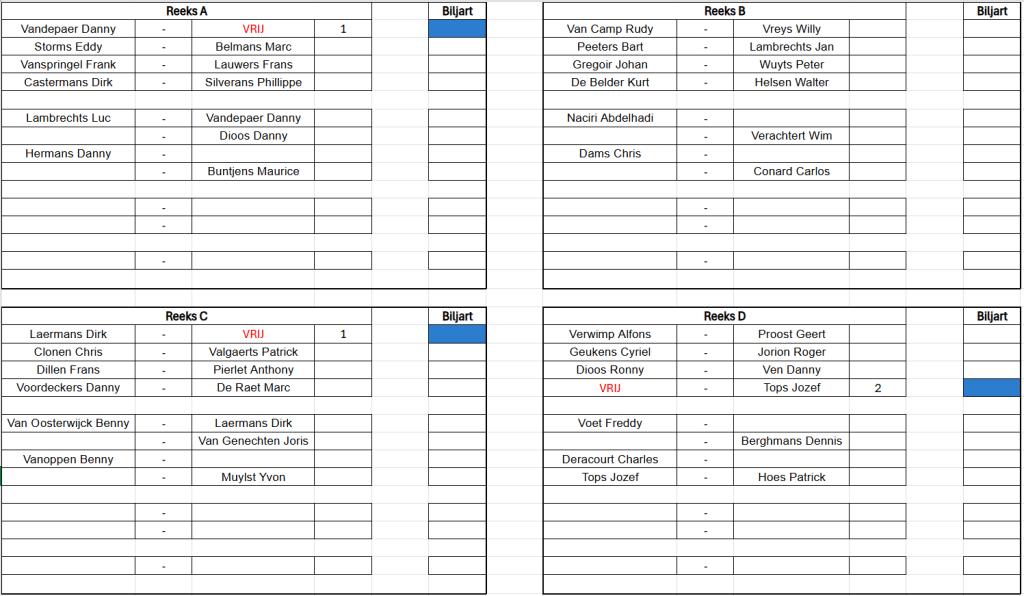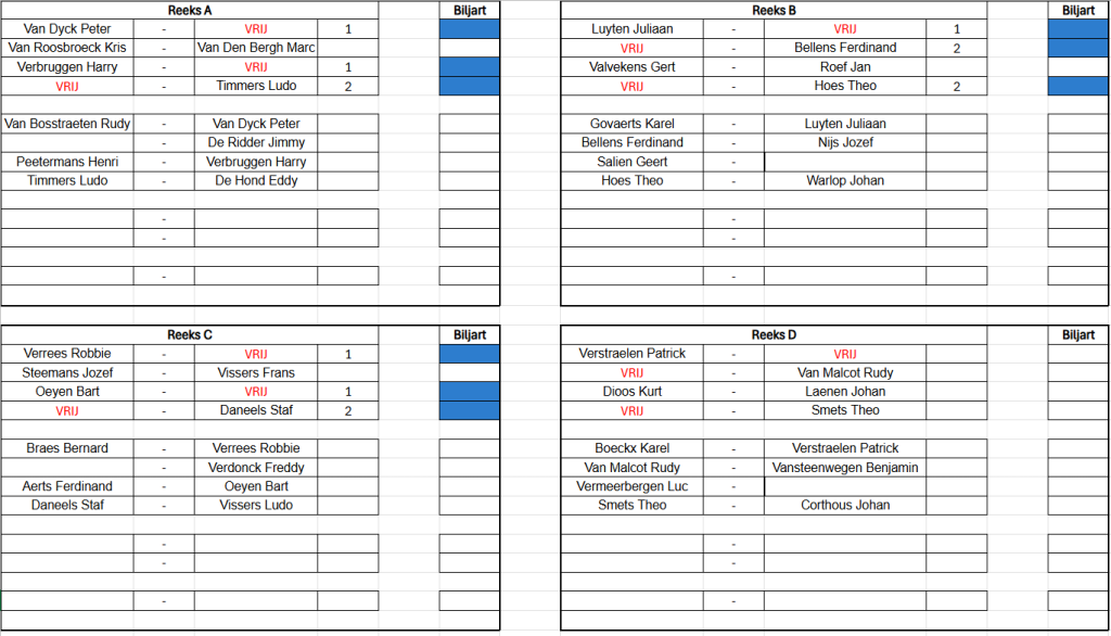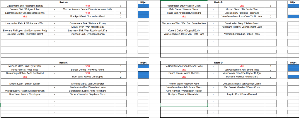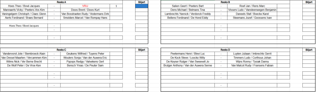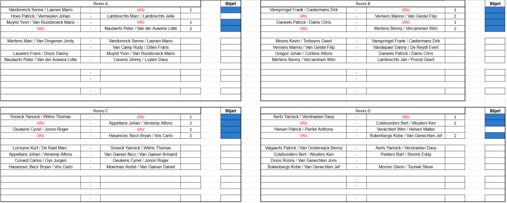 Verbondskampioenschap GBZA 2026 – Trekking OG Laag - 8 mei 19u00 Schifting C - 9 mei 12u00 Schifting A - 10 mei 12u00 Duo's Hoog - 14 mei 12u00 Schifting D - 15 mei 19u00 OG Hoog - 16 mei 12u00 Duo's Laag - 17 mei 12u00 Schifting B - 22 mei 19u00 Duo's Mix - 23 mei 12u00 Dames - 24 mei 12u00 Jeugd - 24 mei 12u00